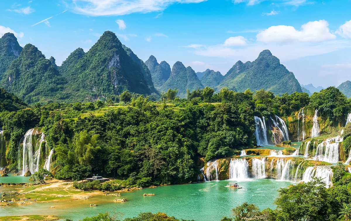Le fleuve irrigue des terres fertiles, bordées par des plages de sable blanc et des formations karstiques emblématiques du Vietnam.