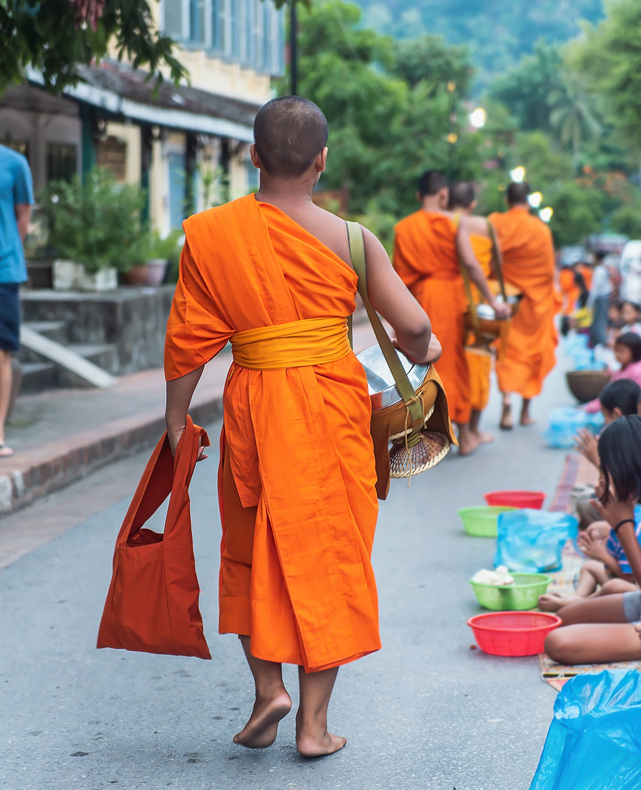 Au petit matin, les moines en robe safran collectent les offrandes dans les rues de Luang Prabang, perpétuant une tradition bouddhiste immuable.