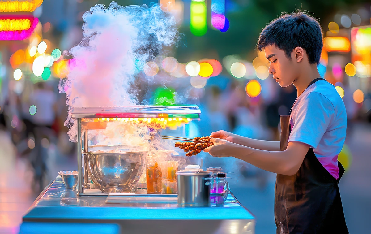Les marchés nocturnes de Bangkok proposent une cuisine vibrante, où les woks fument et les brochettes grillent sous les néons.